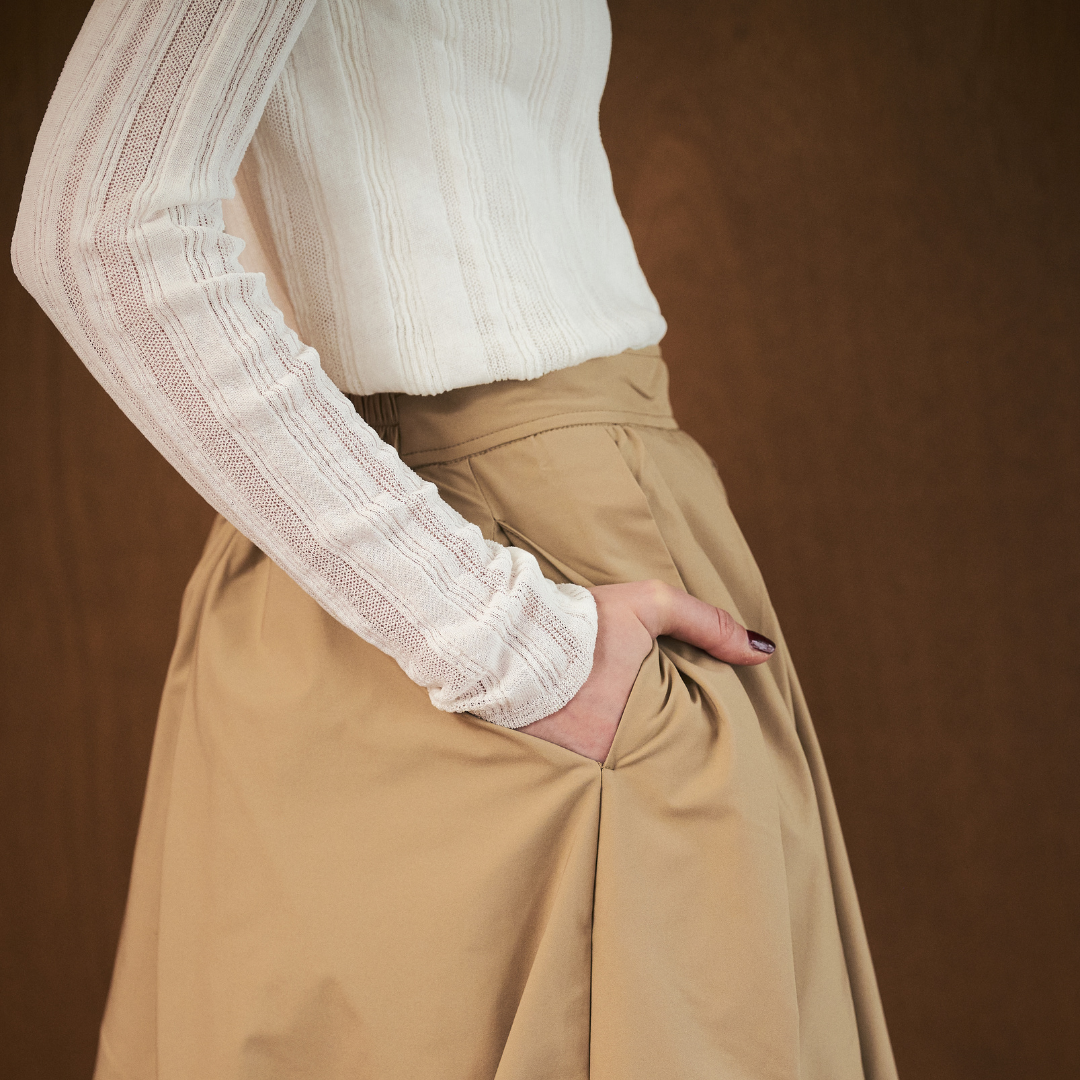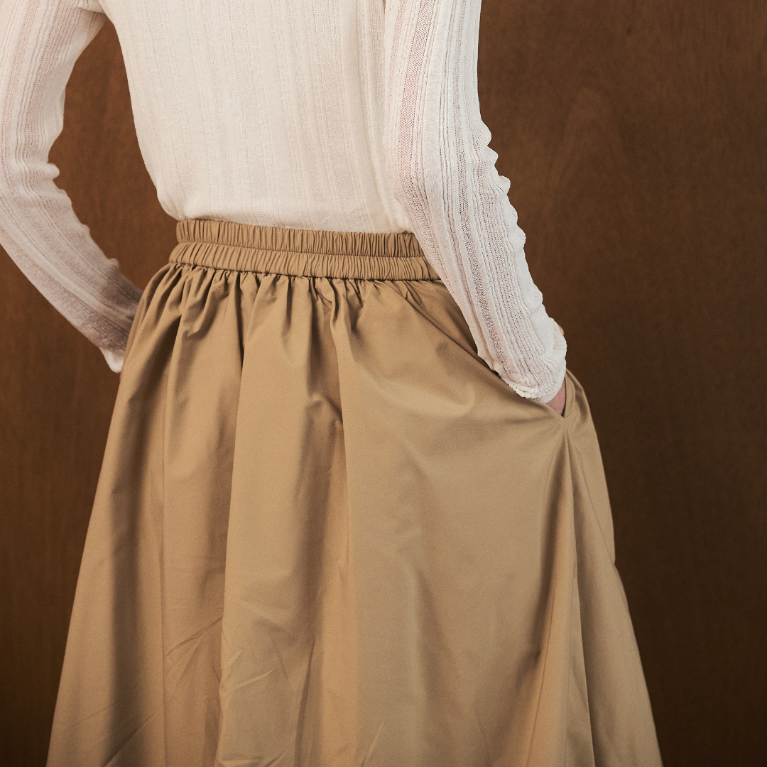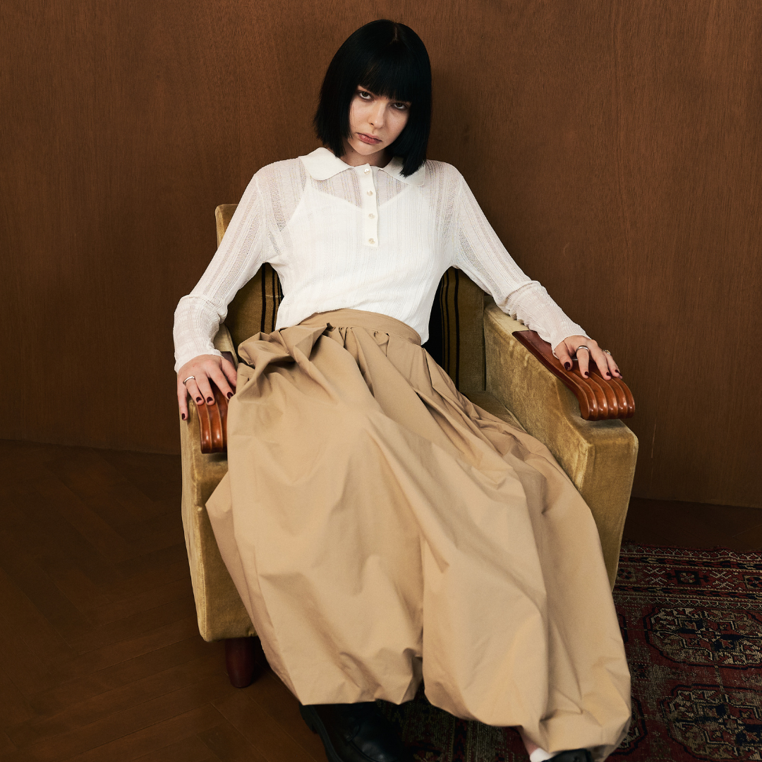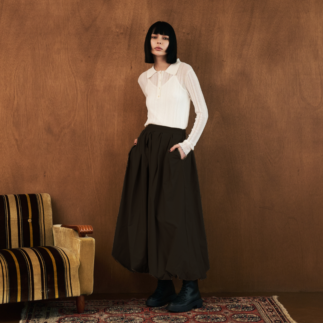 ・ハリとボリューム感のあるポリエステル素材を使用し、タックとギャザーで立体的なバルーンシルエットを表現。